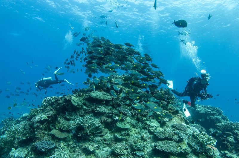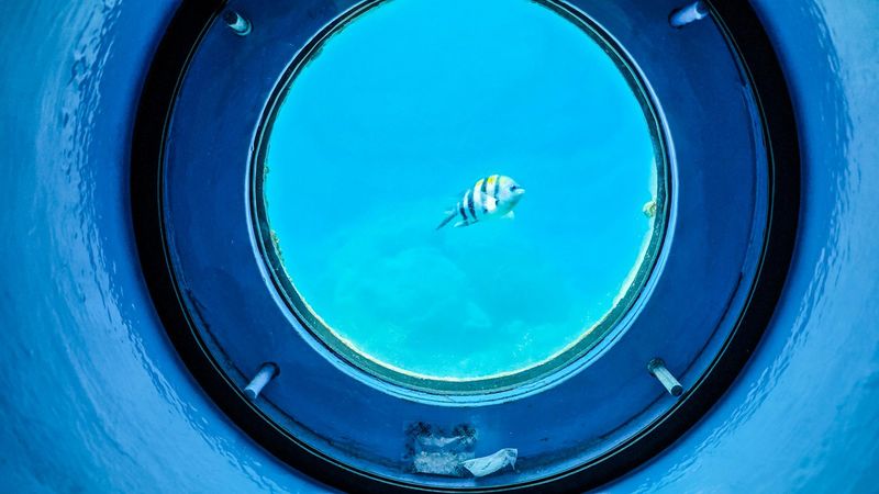 To reach the underwater observatory, you walk along a long bridge over turquoise water until you arrive at a white tower that extends about five metres below the surface. Instead of looking into tanks like in a traditional aquarium, you’re observing wild fish in their natural habitat, swimming freely around the reef.